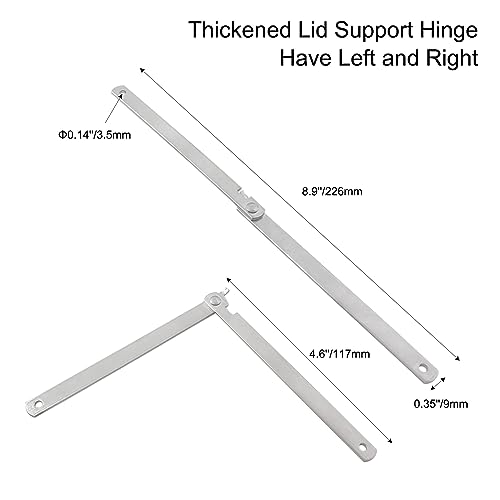 【Package & Size】Includes 2pcs lid support hinges and 8pcs mounting screws. Lid Hinge Size: 8.9″x0.35″/226×9mm(LxW); Mounting hole diameter: 0.14 “/3.5mm