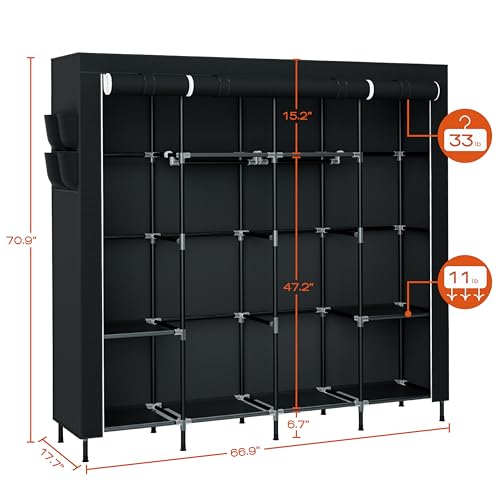 [Stable and Strong] Featuring with steel tubing, high quality non-woven fabric and durable connectors, this wardrobe ensures long-lasting stability and support. Each hanging rod holds 33 lb and Each shelf holds up to 11 lb.