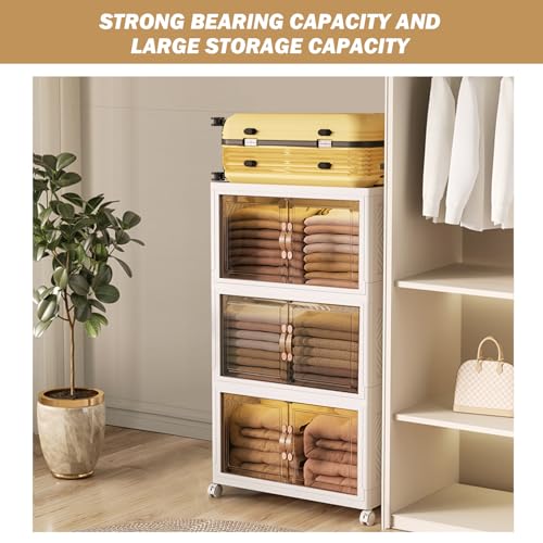 Foldable & Install-Free: The storage bins with lid is a collapsible and install-free storage bin. You can assemble the storage bins with a very simple way within a minute. When you do not need to use, you can fold it up and placed under the bed or sofa Stackable & Moveable: The stackable storage bins with rolling wheels can travel to any part of your house, it prevents the base from moving accidentally with the locking latches.(The wheels are removable, you can also choose not to use the wheels).Fixed buckle design, support multi-layer stacking. When the buckle is in the “on” position, you can easily move the box, when in the “off” position, is a fixed state