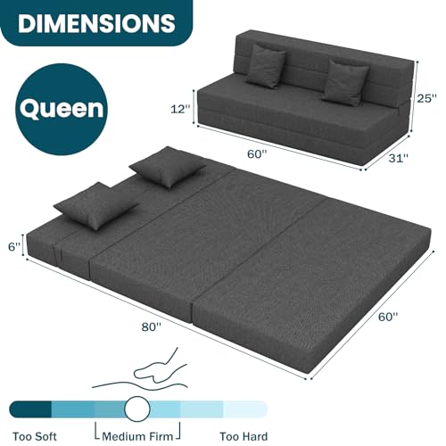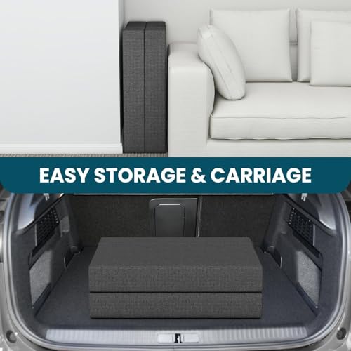 Easy Maintenance and Storage – No need for cumbersome bed frames or dedicated storage spaces. This foldable bed mattress folds up neatly, making it a breeze to store under a bed, in a closet, or even behind a door when not in use. Plus, its soft touch jacquard cover can be removed and thrown in the wash to get rid of any pesky accidental stains. (Unfolded back section must be laid against a wall to turn the mattress into a chair).