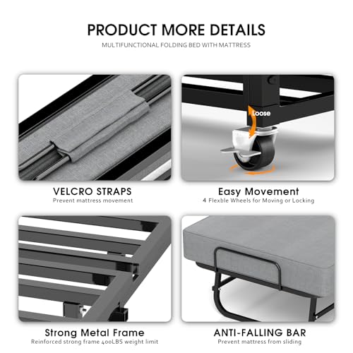 Strong and Stable Frame The metal folding bed with mattress designed with reinforced square tubing, that ensure to provide firm support without sagging, no noise or squeaks. Weight capacity of 450 lbs