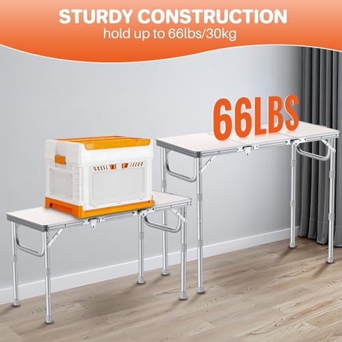 【Stable & Durable】This small foldable table is made of thickened aluminum alloy frame and the desktop size is L34.2” x W15.7”, which can hold up to 60lbs/30kg. The triangular support structure of each side and 4 secure latches to ensure stable use