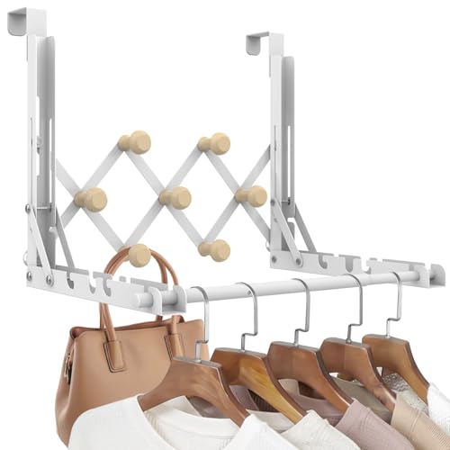 Collapsible Expandable Design & Multifunctional: This over the door organizer rack designed with folding capability, space saving while not in use. It also can be use in different way. You can use as a over the door towel rack with 7 hooks by expanding the 2 side hanger arms, also can be as a clothing drying rack by unfolded hanger arms with the rod. Each part can be used separately