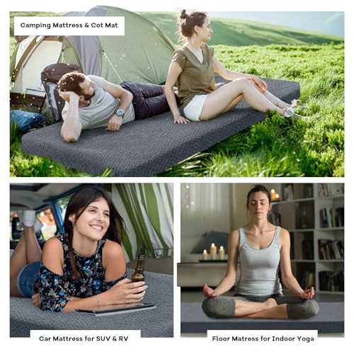 【PORTABLE DESIGN】The memory foam camping mattress rolls up easily for storage and travel. The lightweight mat is easy for you to carry. Equipped with storage strap for backpacking, hiking, road trips or yoga classes, etc.Our memory foam sleeping pad measures 72’’ Length, 24’’ Width and 3’’ Height to fit more persons and packing straps are included.
