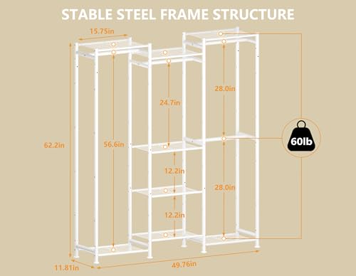 Sturdy and Durable: Dimensions:49.76″ Lx11.81″ Wx62.2 ” H. The entire wardrobe is made of iron and each main steel tube is 16mm thick to ensure that it is not easily bent. The wardrobe system uses screws to secure the steel tubes, providing stability and sturdiness. In addition, the balancing feet can be adjusted to enhance stability on any surface.