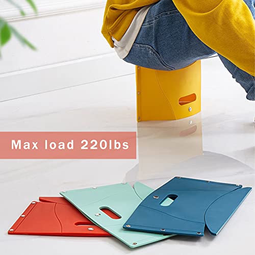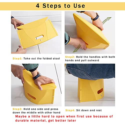 4 Steps to Use: Step 1: Take out the folded stool. Step 2: Hold the handles with both hands and pull outward. Step 3: Hold one side and press down the middle with other hand. Step 4: Sit down and rest. Maybe a little hard to open when first use because of high quality durable PP material, get better later.