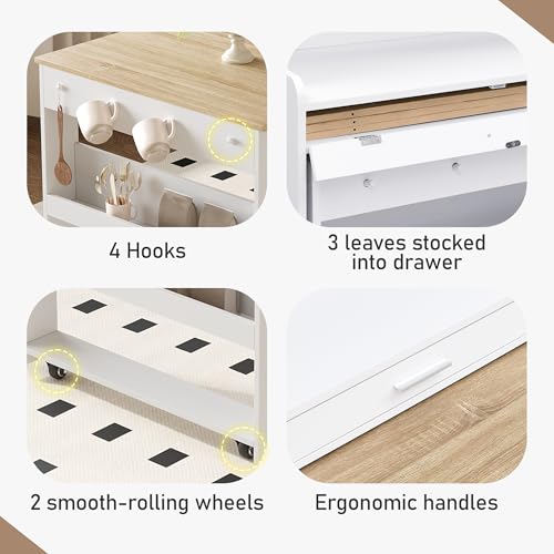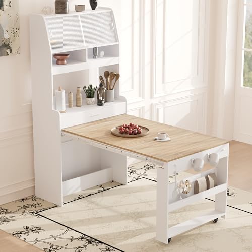 [Expandable Dining Table & Multifunctional Workspace]: This wheeled table extends from zero to 50.4”L using the removable leaves, comfortably seating 4-6 guests. When the festivities conclude, slide the table under the buffet for easy storage. The 15.2”W counter-height workstation serves multiple purposes, functioning as a coffee bar, office desk, or kitchen prep area, and includes a side shelf for quick access to everyday essentials and four hooks for hanging utensils, towels, or keys.