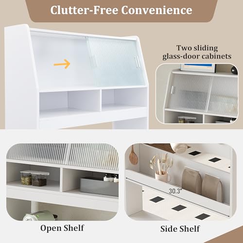 [Versatile 2-in-1 Design + Chic Storage Solution]: Optimize your space with this buffet hutch that seamlessly combines a foldable 50.4”L dining table and a stylish storage unit. The compact design allows the table to neatly tuck away beneath the 15.2”W workstation when not in use, while three removable leaves conveniently fit in the drawer. Featuring two sliding glass-door cabinets and an adjustable shelf, you’ll keep your dishes, decor, or pantry essentials organized in style.