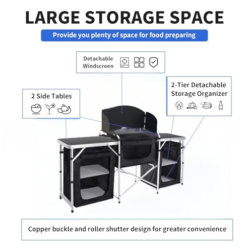 Spacious storage space: The camping cooking table is equipped with 26″ * 15″ roll-up aluminum tabletop, 2* 24″* 15.75″ side tables, which can hold grills, cookers, and other supplies. The 32L double-layer detachable storage box provides you with ample space, and at the bottom of each layer of storage is lined with pads, which will not deform even when loaded with 30 pounds of items. You can arrange the tableware neatly