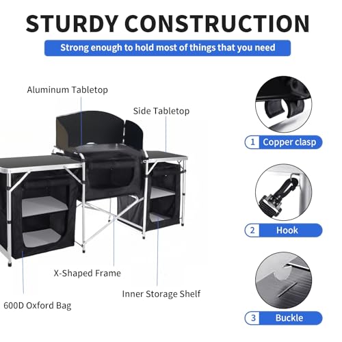 Moosinily portable camping table – The outdoor cooking table Consists of 1 aluminum cook station, 2 aluminum side tables, 2 layers of countertops,3 Oxford Storage bags. The Unfolded dimension 68.5″L x 16.5″W x 43.5″H; Folded dimension: 31″ (L)* 22″(W)* 4″(H); NWT: 27 lBS