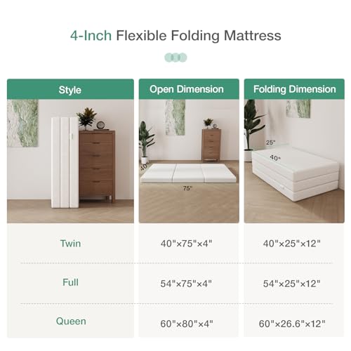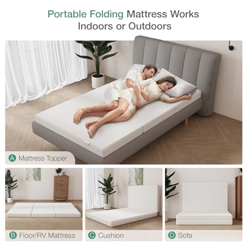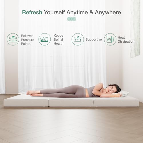 COMFORT IN MORE THAN ONE PLACE and ONE WAY- This portable queen trifold mattress supports every contour of your body to help with pressure relief and spine alignment. You’ll enjoy a peacefull rest and refresh yourself anywhere. Besides being a foldable floor mattress, it’s multifunctional and can be folded into a sofa, cushion, or foldable mattress topper as needed.