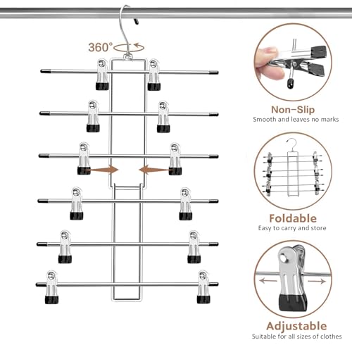 Hanger space saving: Our hangers with clips are composed of 12 clips; one hanger can hang at least 6 pieces of clothes, very suitable for hanging your skirts, trousers, scarves, socks, and other clothes. Pants hangers with clips can make your wardrobe more organized.
