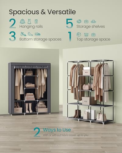 【ONE STORAGE STATION FOR ALL】With 2 hanging rods for your daily outfits, 5 storage shelves for underwear, socks, and 3 bottom storage spaces for shoes, or storage boxes, this non-woven fabric wardrobe provides ample space for everything