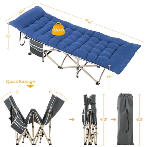 Comfort-upgraded Camping Cot: This upgraded outdoor cot comes with an 8 cm/ 3.1″ thick soft mat with a 90g Polyester cover and premium filling. To prevent the uneven distribution of the filling after using it for a while, outside the mat is sewn with thread vertically and horizontally, making the filling fixed in the specific area